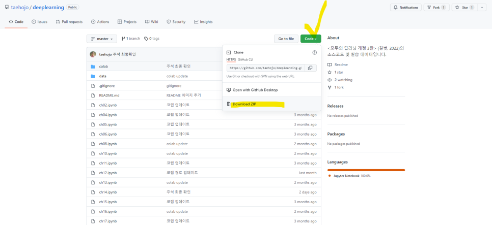 주피터 노트북으로 파이썬 프로그램을 실행할 분들은 저자 깃허브에서 집파일로 다운 받아서 사용하시면 됩니다.