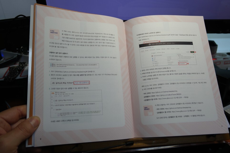 딥러닝을 공부하면서 무엇보다 개념을 설명하기 위해 페이지를 활당해서 개론적인 내용을 자세하게 다루고 있는 책입니다.