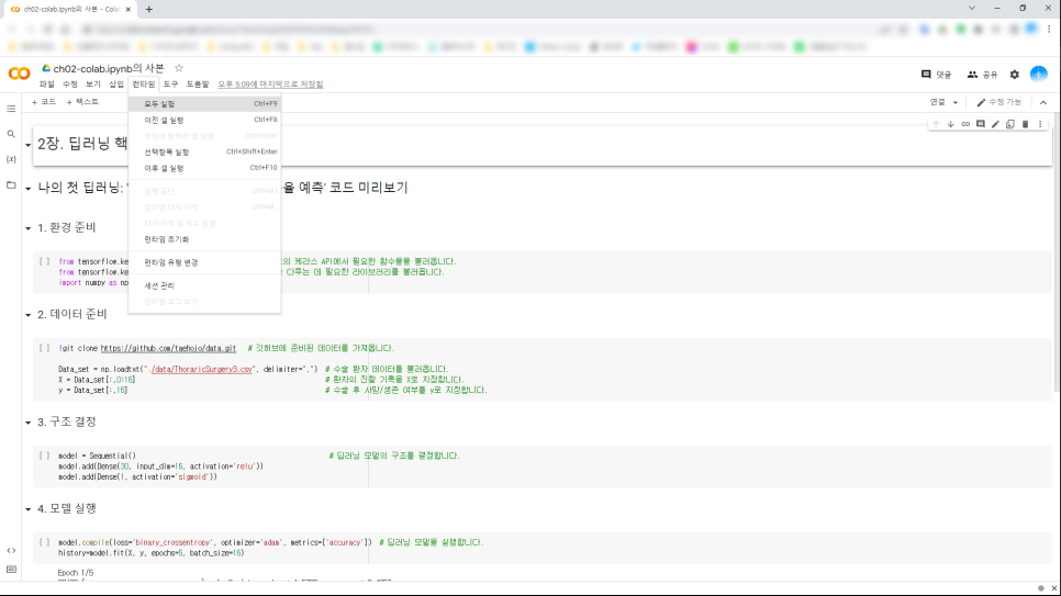 웹브라우저로 구글 코랩에 접속해서 딥러닝을 위해 필요한 편집을 마치면 구글 클라우드 서버에서 해당 프로그램이 실행되고 결과를 구글 코랩에 보여줍니다.