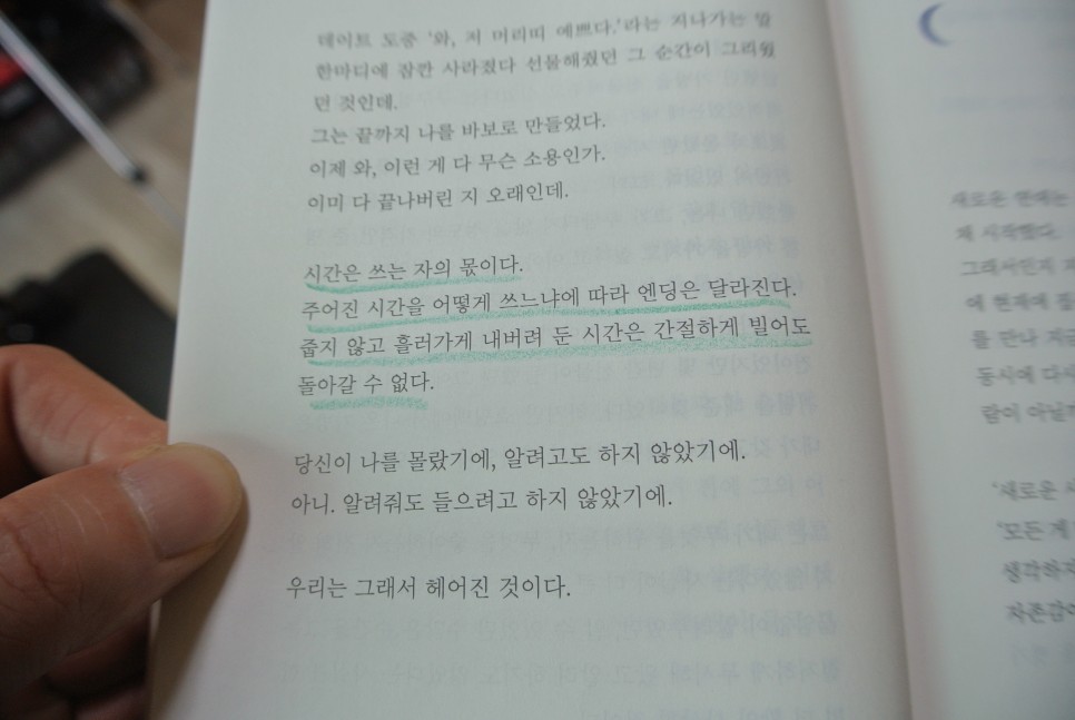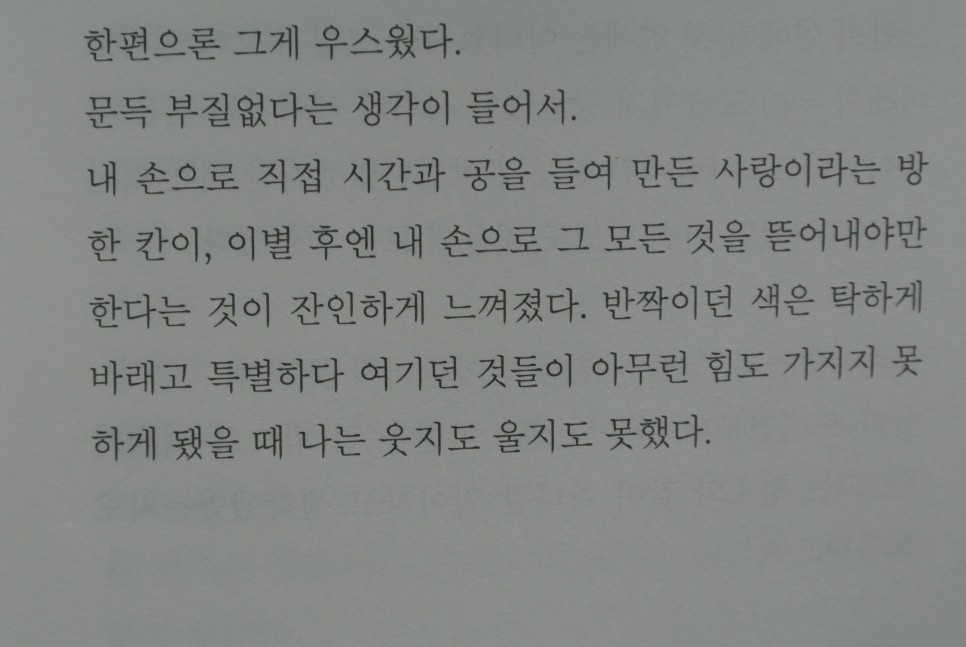 '내 손으로 직접 시간과 공을 들여 만든 사랑이라는 방 한 칸이, 이별 후엔 내 손으로 그 모든 것을 뜯어내야만 한다는 것이 잔인하게 느껴졌다.'