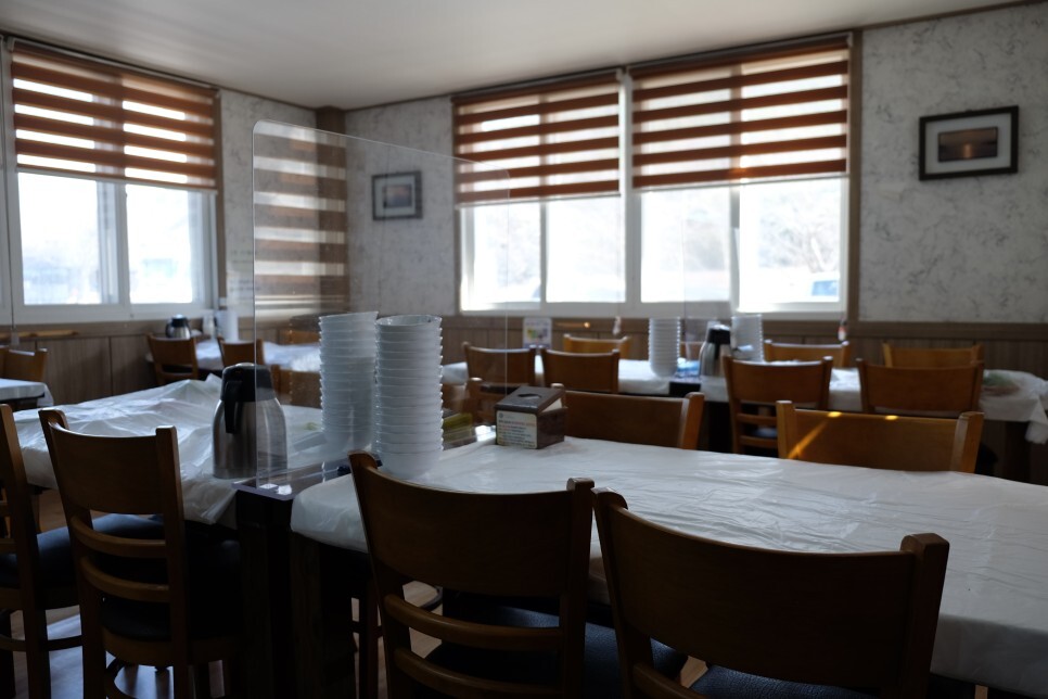 식당 안으로 테이블로 세팅 되어 있습니다.