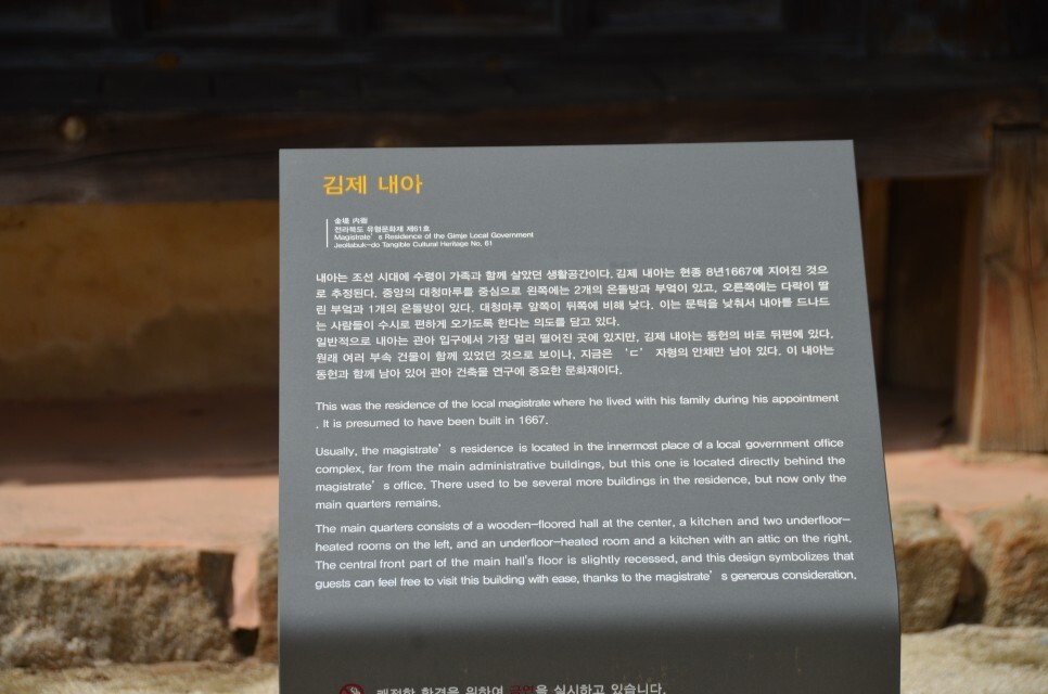 일반적으로 내아는 관아 입구에서 가장 멀리 떨어진 곳에 있지만, 김제 내아는 동헌의 바로 뒤편에 있다.