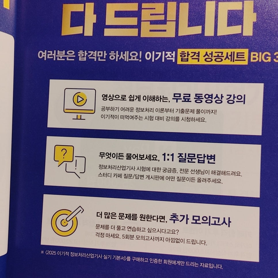 영진닷컴에서는 도서를 구매한 사람을 대상으로 무료 강의와 이기적 스터디 카페에서 다양한 자료 파일을 제공해 주기 때문에 영진닷컴 수험서로 공부하시는 분들이 함께 스터디할 수 있도록 구성되어 있습니다.