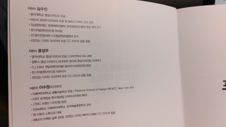 맛있는 디자인 프리미어 프로 집필 저자인 심수진님과 윤성우님, 맛있는 디자인 애프터 이펙트 집필자인 이수정님이 함께 만든 책입니다.