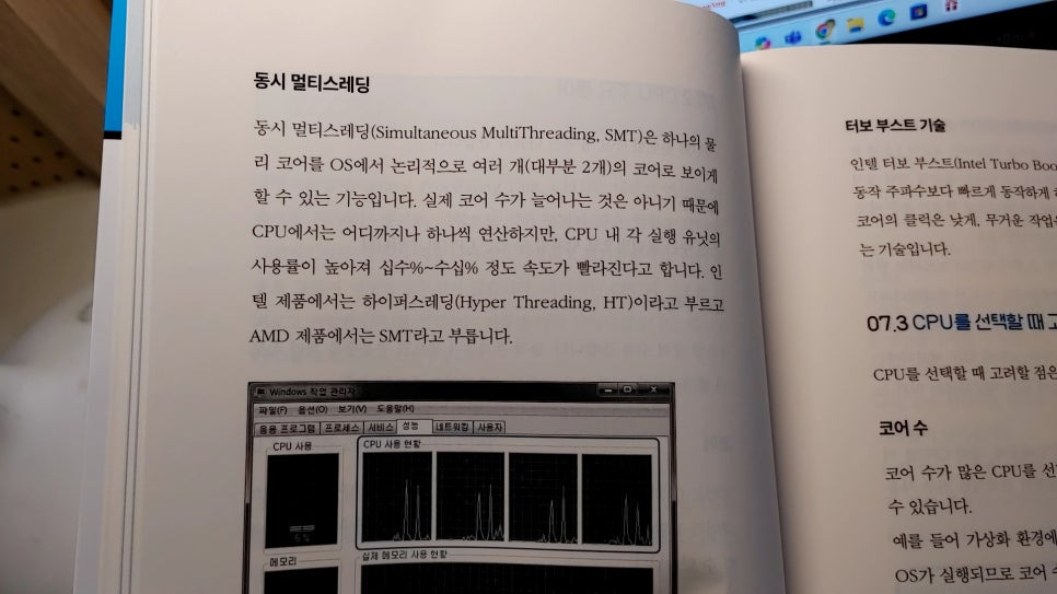 예를 들면, 4코어 CPU인데, 운영체제에서 8개의 논리 코어(스레드)로 인식하는 기술입니다.