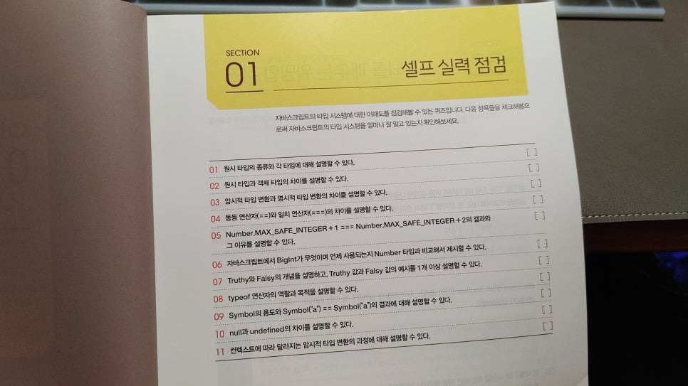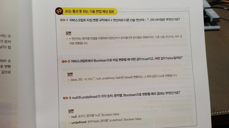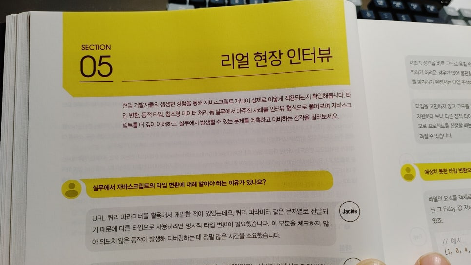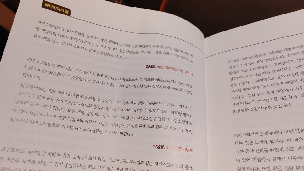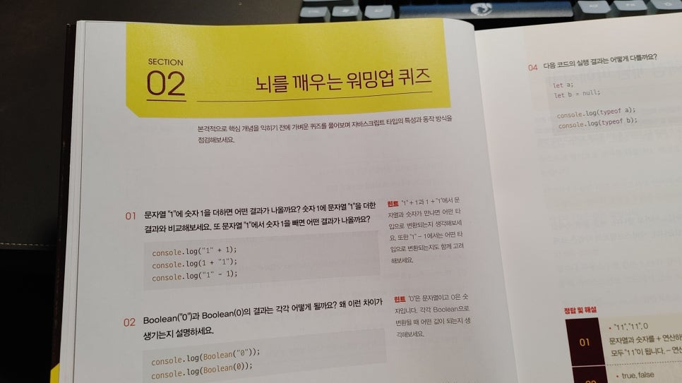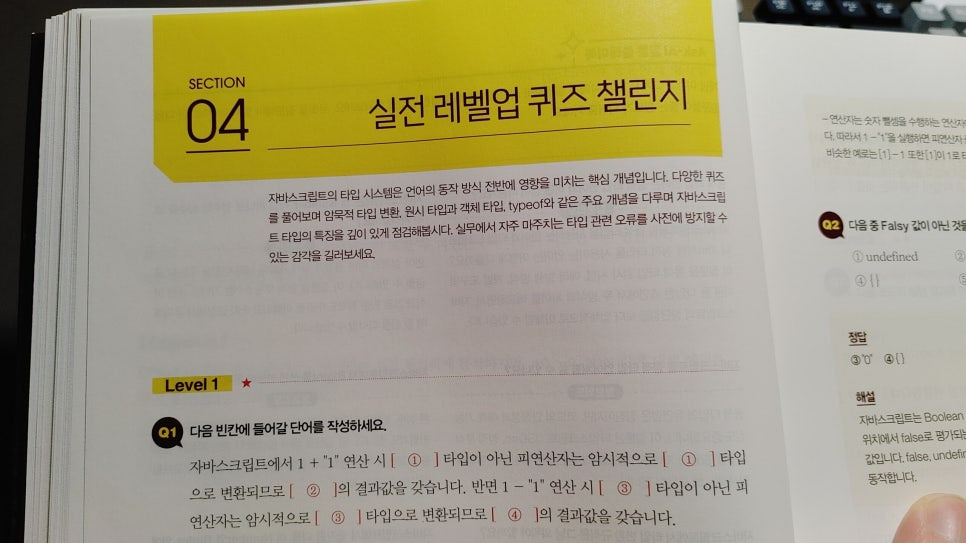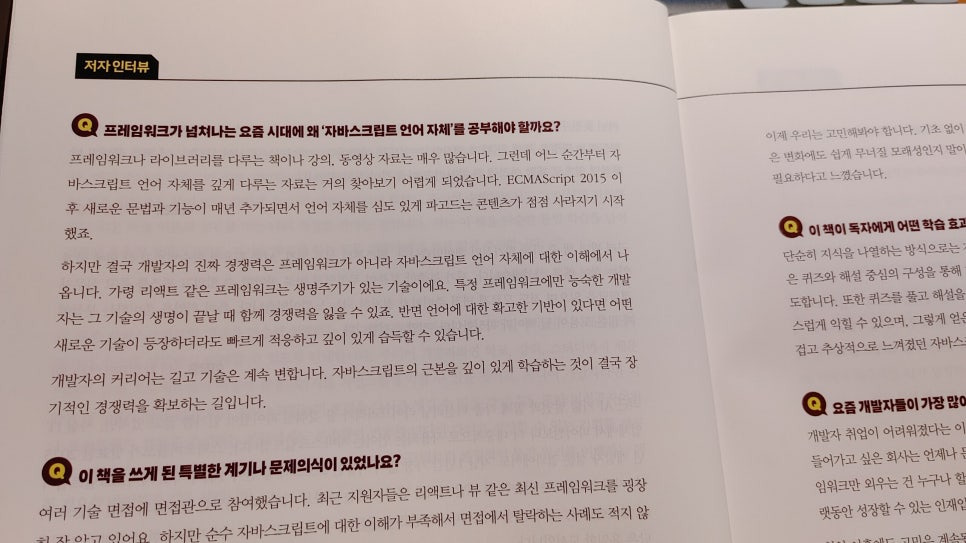 퀴즈는 단순한 형태로 만들지 않고 좀 더 전문적인 행태를 취하고 있습니다. 실무에서 접할 법 한 문제 상황이나 기술 면접 예상 질문과 같은 형태로 자바스크립트를 제대로 이해하고 있는지 확인해 볼 수 있는 책입니다.