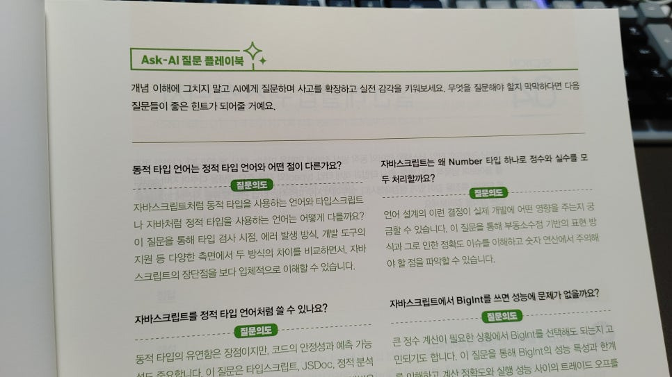 책을 공부하면서 인공지능을 통해 심화 학습할 수 있는 가이드도 제공하고 있습니다. 이 책의 문제를 다 풀 수 있다면 자바스크립트를 마스터했다고 자신 있게 말할 수 있다고 하니 관심 있는 분들은 도전해 보시면 좋겠죠.