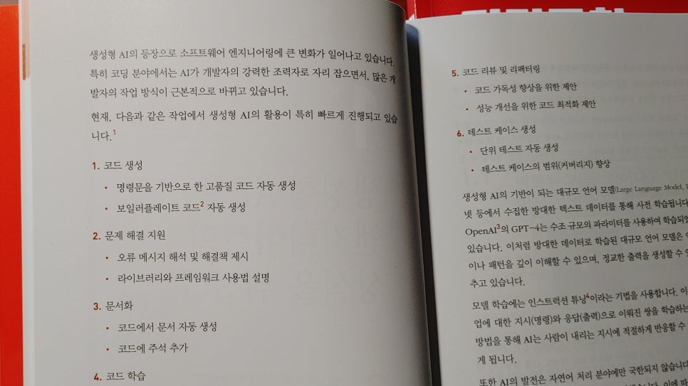 저자는 AI가 기존의 소프트웨어 개발 업무의 일부를 대신해 주는 시대라고 말합니다. 코드를 생성하는 일, 문제가 발생하면 해결을 지원하고, 문서화하며, 코드 질문에 답변을 해주고 성능을 개선시켜 최적화를 제안하고 마지막으로 테스트까지 모든 과정을 인공지능의 도움을 받을 수 있다고 말합니다.