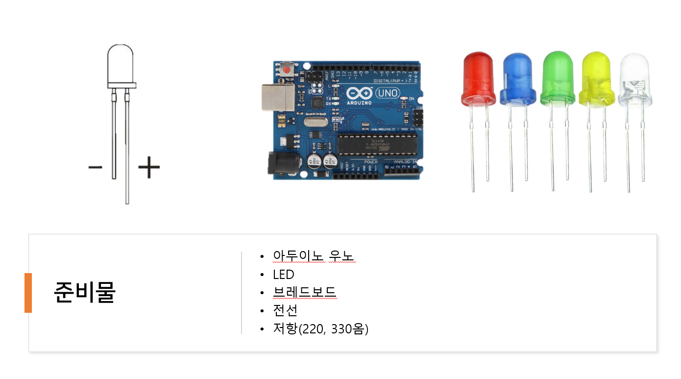 아두이노와 LED, 그리고 저항인데요.