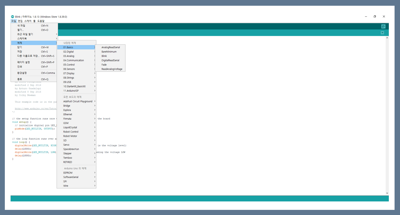 자체 예제에서 Blink 파일을 열어 보시면 되는데요.