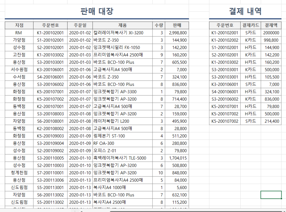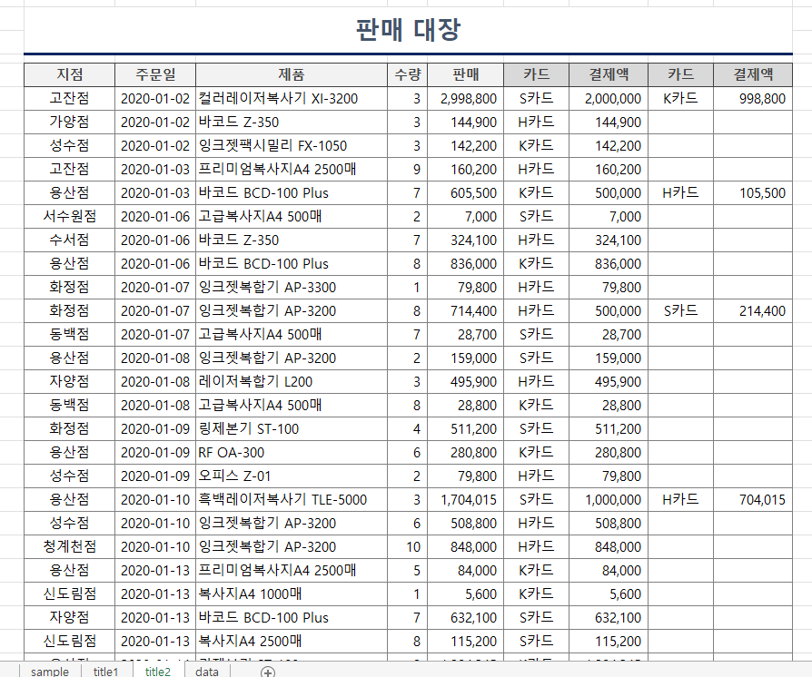 그런데 카드 결제액이 하나가 아니라 여러 건일 때는 사용자가 보기 편하게 위처럼 엑셀 파일을 기록합니다.